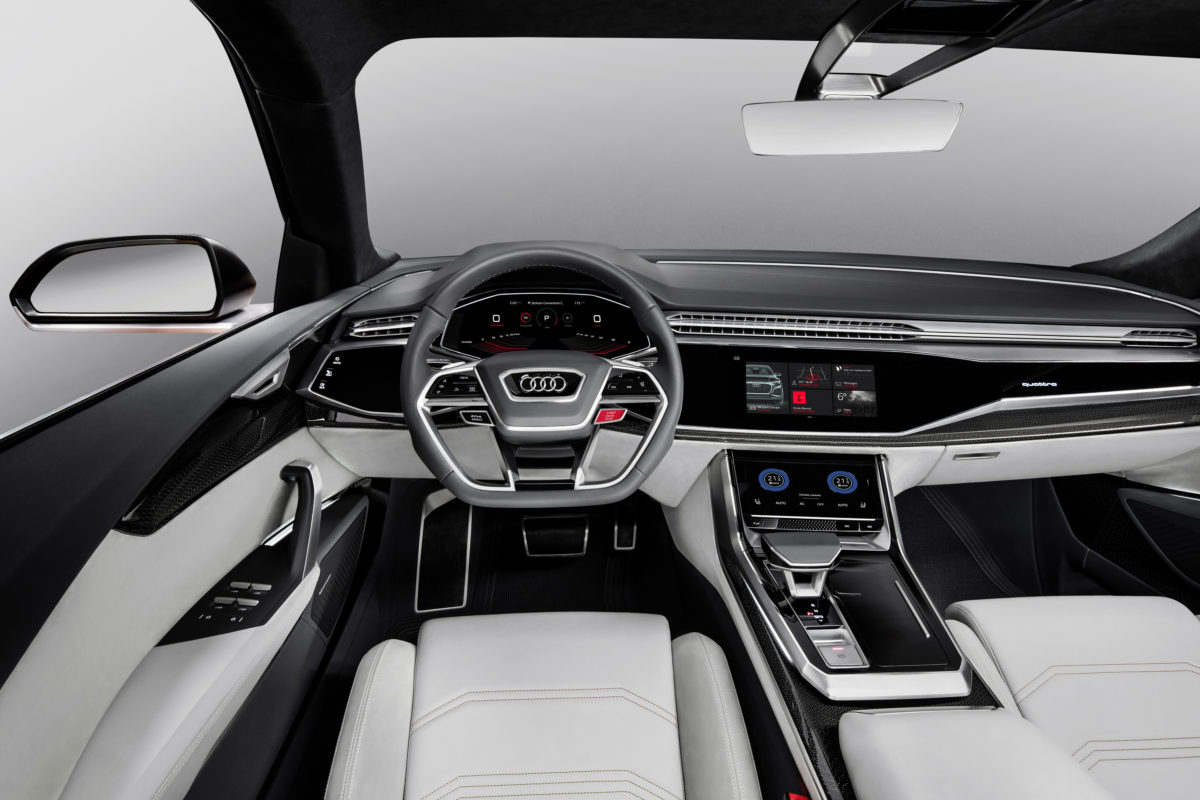 Elegantní uspořádání interiéru studie Audi Q8 sport concept se snoubí s progresivním konceptem ovládání a zobrazování. Informace a povely jsou z velké části realizovány prostřednictvím dotykových displejů, které doplňuje panel přístrojů Audi virtual cockpit future a kontaktně analogový průhledový displej. Všechny ukazatele mají nový digitální design, který se důsledně soustředí na nejdůležitější sdělení.