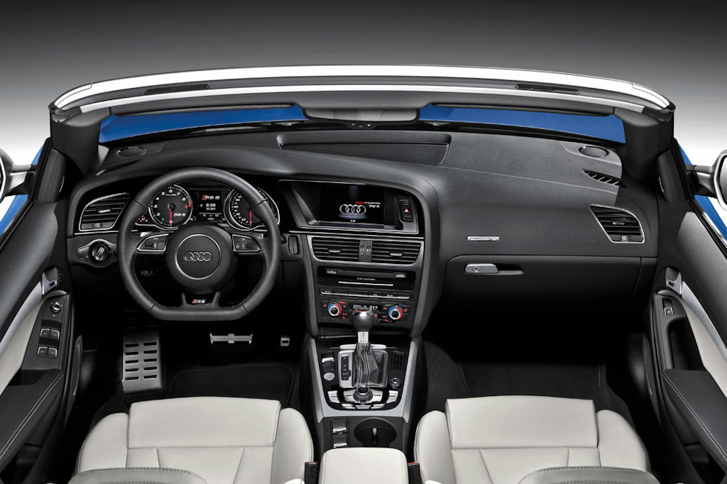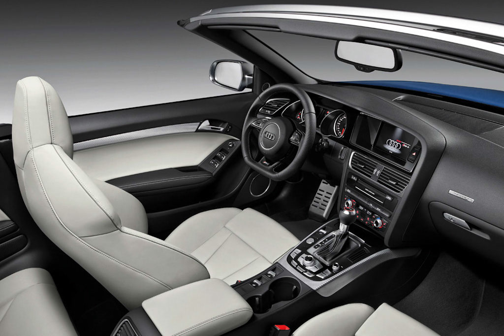 Interiér modelu Audi RS 5 Cabriolet je černý, čalounění stropu plátěné skládací střechy může být na přání stříbrné. Dynamický vzhled podtrhují jemné chromované ozdobné prvky, decentní leskle černé kryty a ozdobné obložení z uhlíkového kompozitu. Volitelně bez příplatku dodává Audi také ozdobná obložení v provedeních hliník Race, černý klavírní lak, kartáčovaný matný hliník nebo tkanina z vláken ušlechtilé oceli.