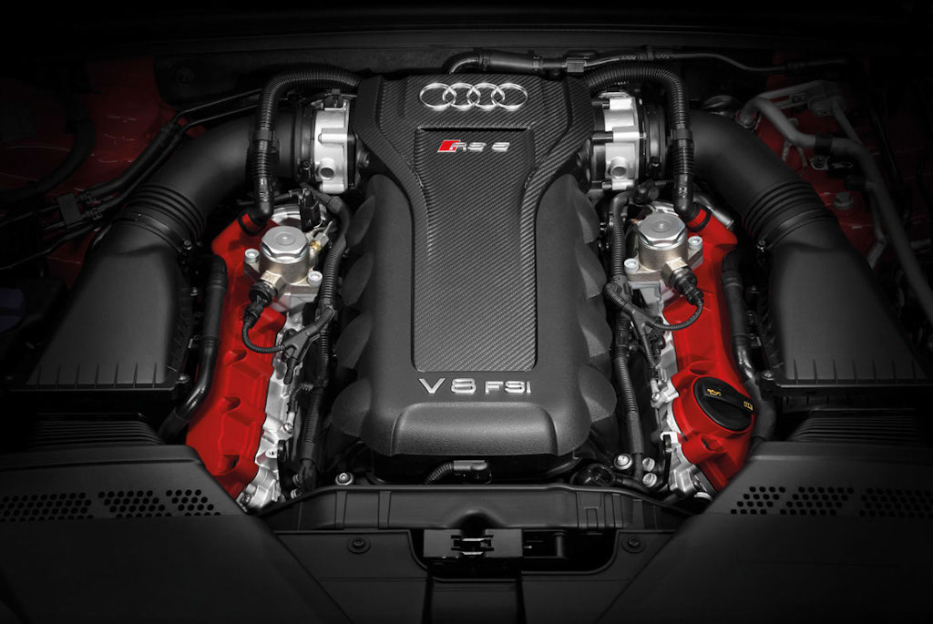 Pohon modelu RS 5 Cabriolet obstarává vysokootáčkový motor V8 s atmosférickým plněním a přímým vstřikováním FSI. Ze zdvihového objemu 4163 cm3 mobilizuje nejvyšší výkon 331 kW (450 k) při 8250 min-1 a mezi 4000 a 6000 otáčkami za minutu poskytuje maximální točivý moment 430 N.m. Motor 4.2 FSI s červeně lakovanými kryty hlav válců, jehož montáž probíhá ručně v maďarském závodu Györ, dosahuje specifického výkonu 79,5 kW (108,1 k) na litr zdvihového objemu. Na každý kW (k) výkonu připadá pouze 5,8 kg (4,267 kg) hmotnosti vozu. Dlouhozdvihový motor s hliníkovým blokem si užívá otáček a jeho zvučný projev dirigují klapky v koncovkách výfukové soustavy. Na přání dodává Audi sportovní výfukovou soustavu s černými koncovkami.