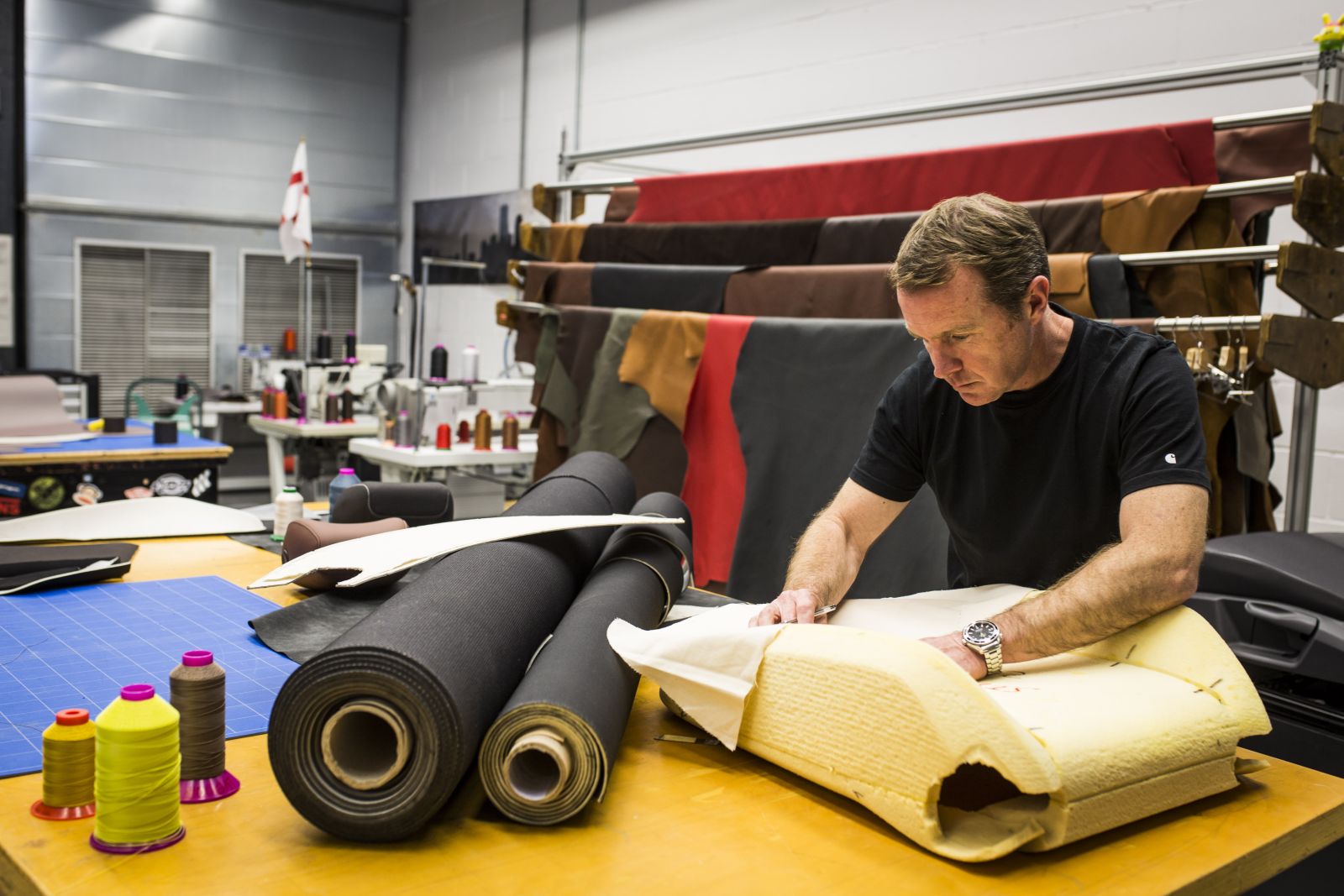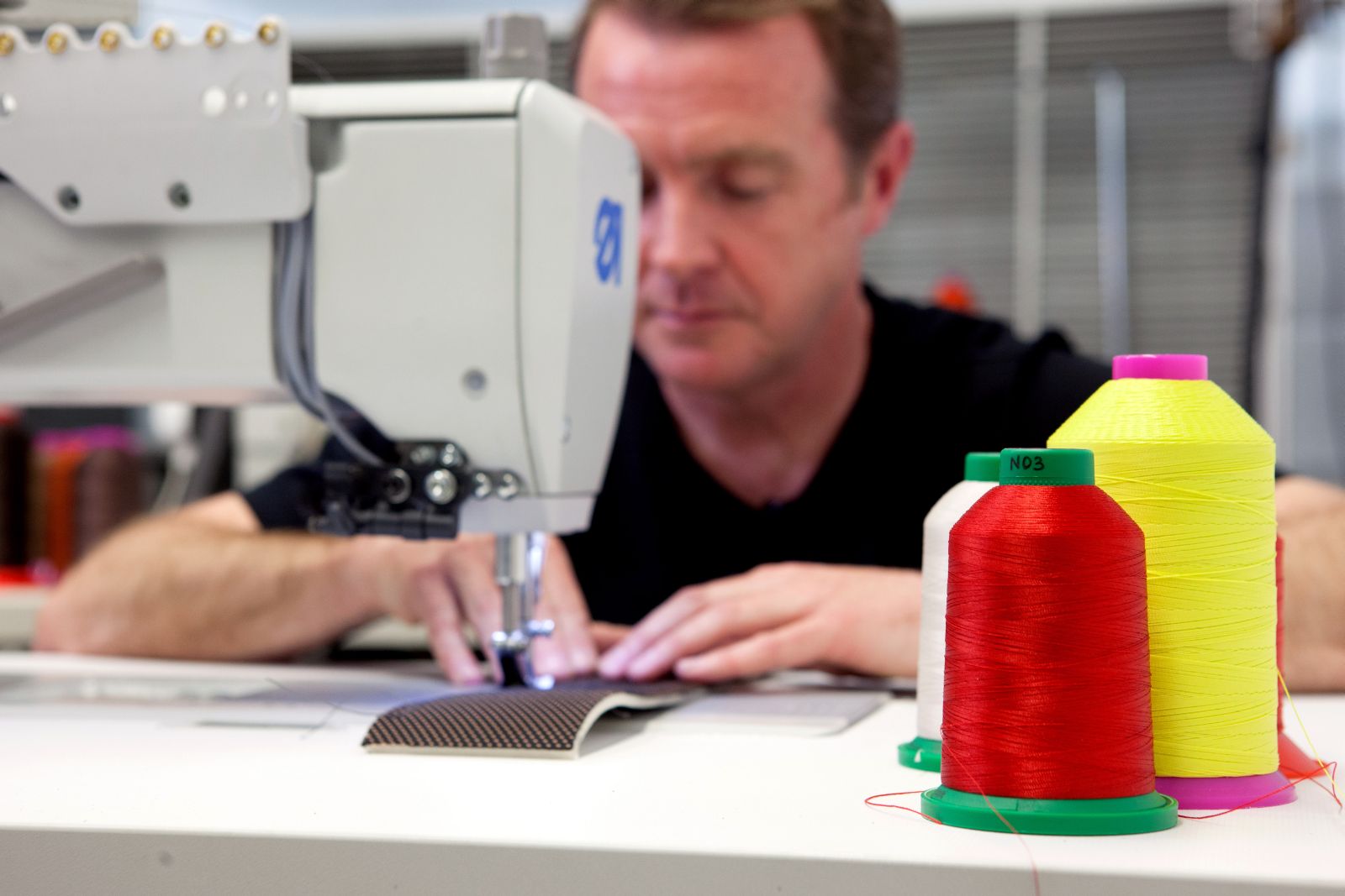 / Tento „automobilový krejčí“ použije každý rok 30 km nití na prošívání sedadel, volantů a hlavic řadicí páky