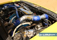 Výfukem proudí spaliny, které produkuje agregát uschovaný pod kapotou. Původní G60ka byla na konci své existence a tak nastalo váhání, kterým motorem jí nahradit. Do úvahy připadaly dvě varianty. Buď oblíbená 1.8T nebo atmosférický 2.0 16V z modelu GTI, oba jsou si co do počtu koní vyrovnaní. Úpravce se, spolu se svým kamarádem Františkem Marchalou, rozhodl pro dvoulitr. Ten totiž hrál velkou roli při naplánované přestavbě s dosazeným turbodmychadlem. Osadili ho totiž typem KKK26 s tlakem nastaveným na 1,2 baru. Museli ovšem provést mnoho změn, aby byl agregát vůbec schopný vyprodukovat nějaký ten výkon. Předně snížili kompresní poměr tím, že osoustružili písty o 2 mm a ke slovu přišly i vyleštěné ojnice, intercooler, svody, nové hadice, trubky a vstřiky z Audi S2. Nutností byl otevřený vzduchový filtr KN. Zajímavostí je, že zde ponechali původní řídící jednotku, která se dočkala pouze přeprogramování. Možná to na první pohled vypadá jako náhodné poskládání součástek z různých aut, ovšem opak je pravdou. Za touto kombinací stojí stovky odzkoušených kilometrů nadšenců do motosportu. Výkon takto upraveného motoru atakuje v současné době hranici 260 koní. Naplánována je i spolupráce s panem Martinem Heřmánkem, který pomůže majiteli zrealizovat navýšení tlaku na 1,6 až 1,8 baru a tím pádem dosažení vytouženého výkonu 300 koní.